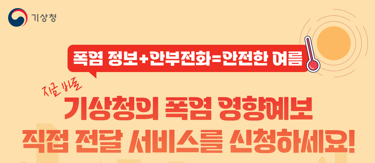 이렇게 폭염영향예보 직접전달 서비스를 통해, 더위를 피하는 것에서 나아가, 생명을 지키는 여름이 되시기를 바랍니다.